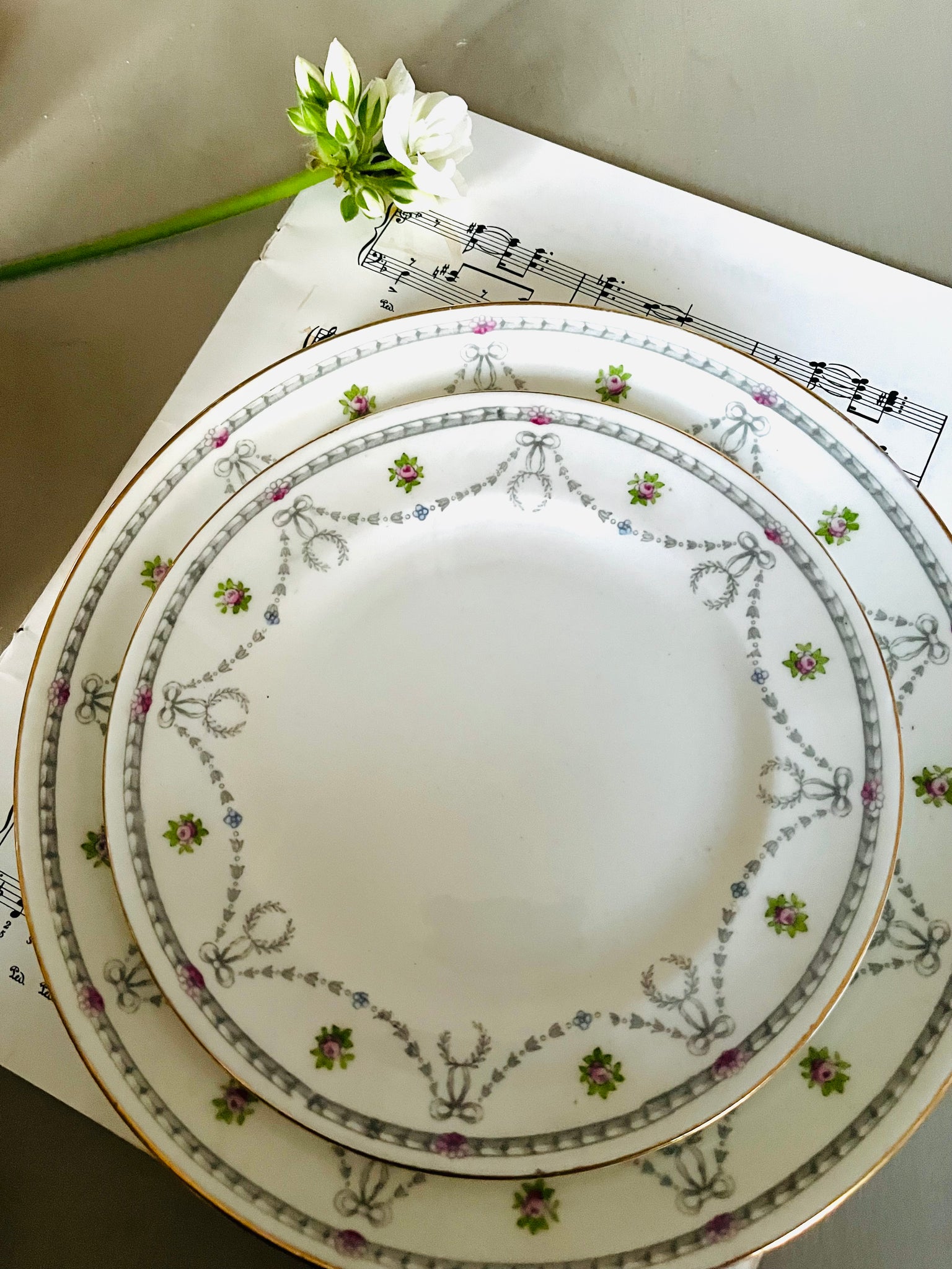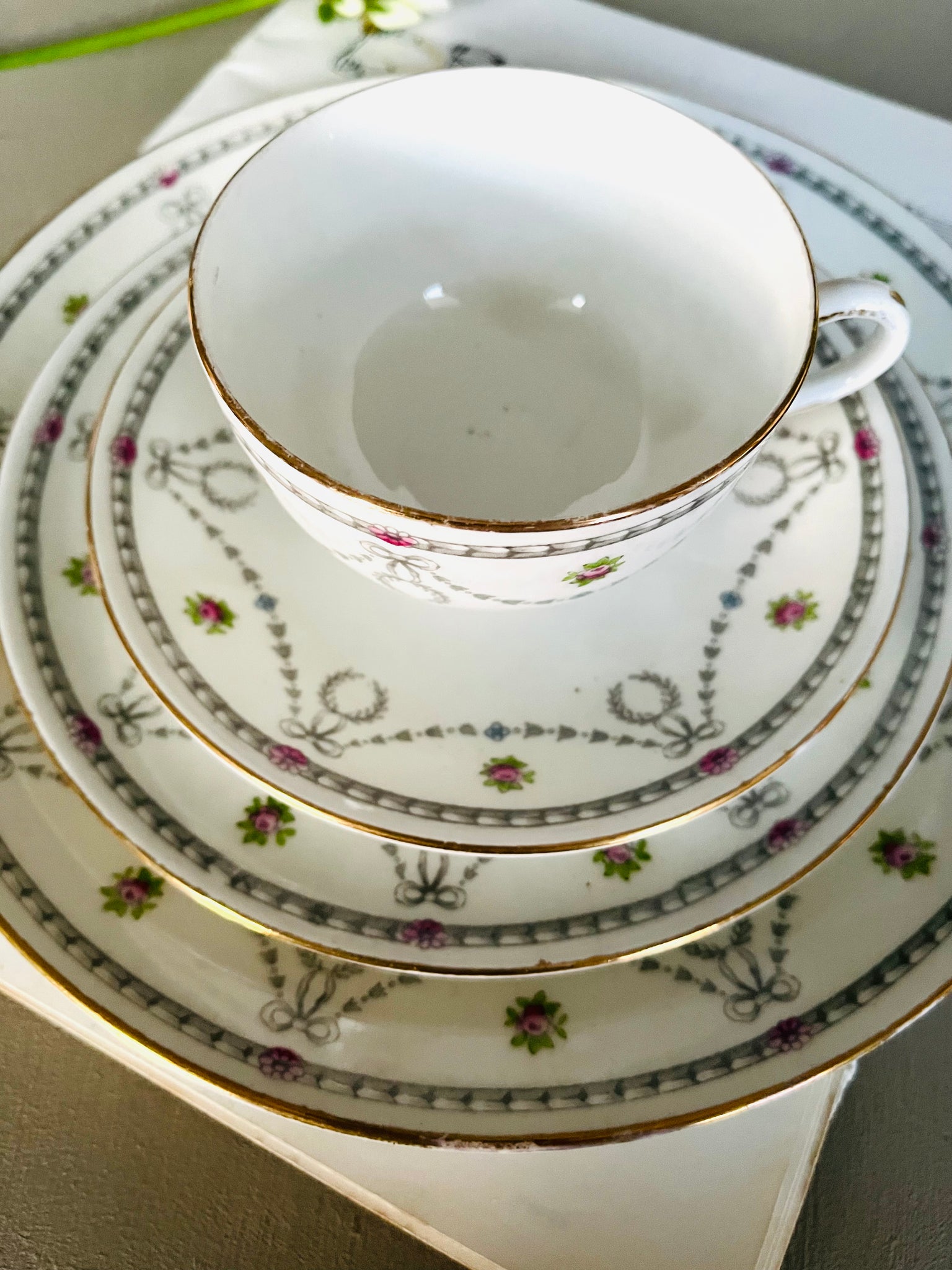 Antique teacup trio featuring swags and bows design