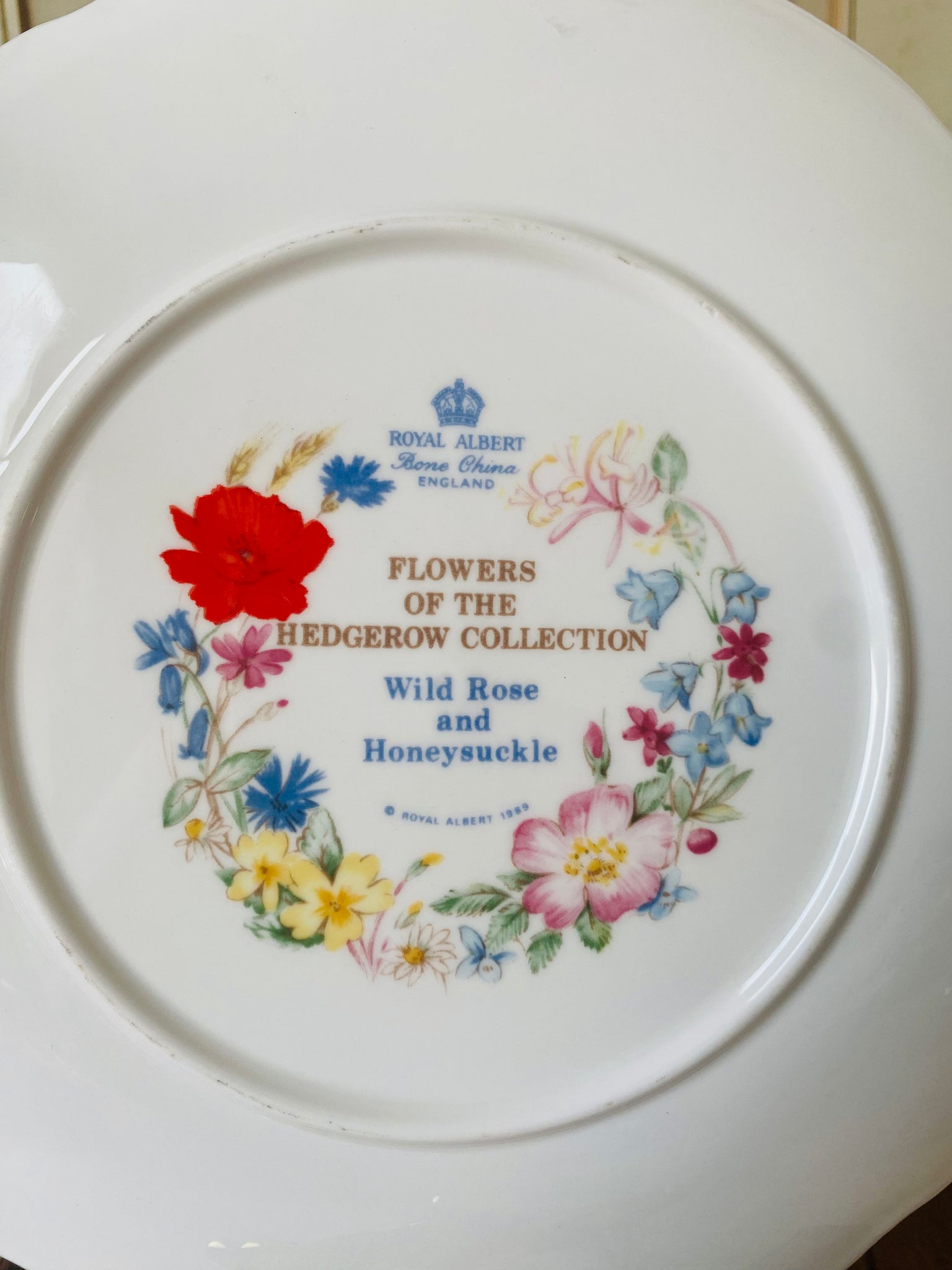 From the flowers of the hedgerow collection this plate features the wild rose and honeysuckle flowers