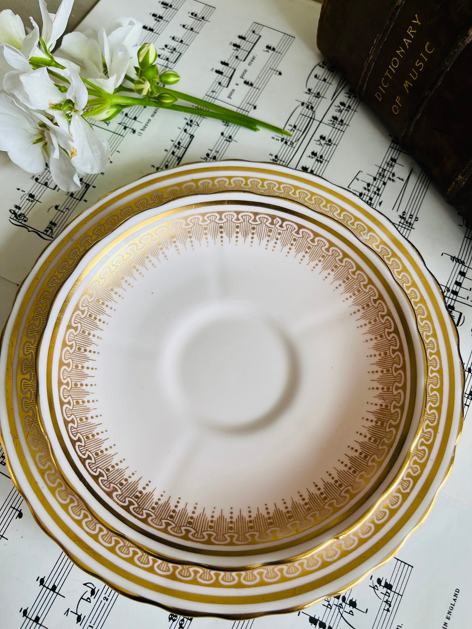 Tuscan 1950s marshmallow pink teacup trio with gilt decoration