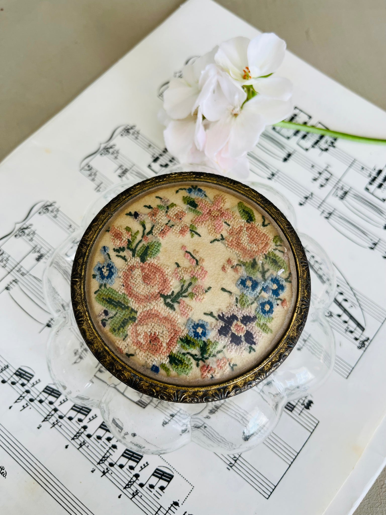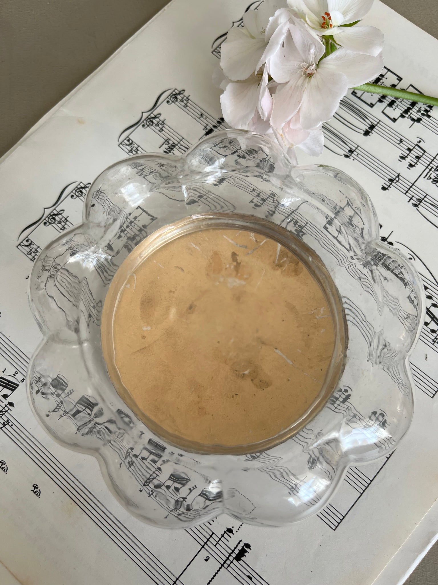 Vintage glass dressing table pot with beautiful flower shaped glass base.